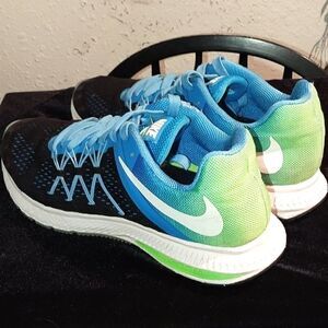 These Nike Zoom Winflo 3 lace up sneakers are a men's size 8.5. Very colorful with black, blue and neon green and Nike swoosh on the side. Nike waffle tread. Pre-owned and in excellent condition there is one small worn part on left shoe where you slip your foot in ( see photo #7). All offers welcome.