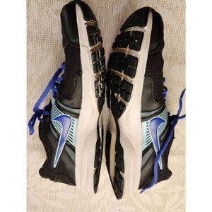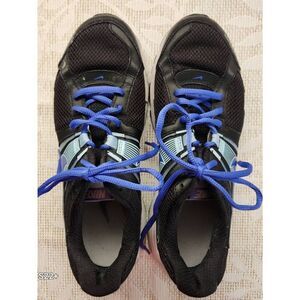 DESCRIPTION: Black athletic shoes with light blue trim and darker blue shoe strings