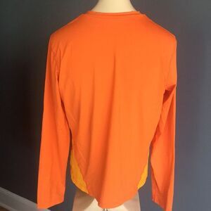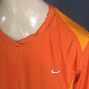 Nike shades of orange color block compression-type fabric top. Banded crew neckline that overlaps at center front. Long sleeves. Flat seam stitching. Nike logo left chest. Nylon/spandex blend. Size medium (8-10) but I think closer to 8. Excellent condition. Nonsmoking home.