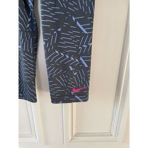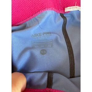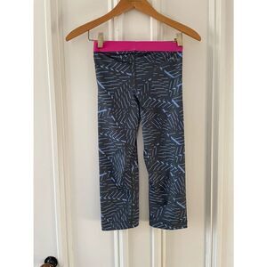 Women’s Nike Pro gray with purple design spandex crop leggings, w/ pink elastic waist band, size extra small, waist is approximately 10 inches but stretchy, rise is 7.5 inches, inseam is 17 inches, great used condition, no piliing.