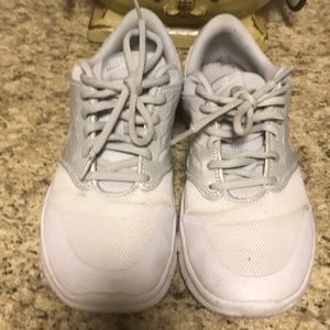 All white Nike’s with gray or silver. In excellent condition the only mishap is on the front of the shoes! Only wore them twice, they have so much life left in them 😊