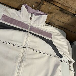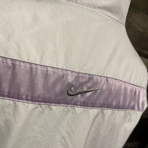 Great condition Nike white tennis jacket with lavender striping. Side pockets. Zip front. I have TONS of items in my closet listed for $9 and under! Pick any 3 and get them all for $15!! Create a bundle, make the offer and save on shipping🙂
