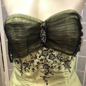 Glamorous slime green dress, in a strapless style with black lace superimposed on a semi-sweetheart neckline, decorated with woven flowers with beading and imitation swaroski stones on the middle of the bust and waist, a wide plate-type skirt with black lace on the edge, with a back zipper to adjust the waist. waist creating the hourglass figure, Beautiful, elegant and chic.