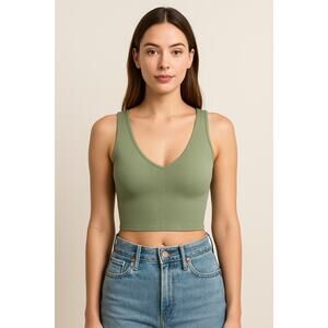 Stay chic and comfy with this Nikibiki ribbed crop top in sage green. Designed with a flattering V-neckline and stretch fit, this minimalist tank is perfect for layering or wearing solo. Style it with high-waisted jeans, skirts, or joggers for an effortless Y2K, casual, or athleisure vibe. Gently pre-loved and closet ready.