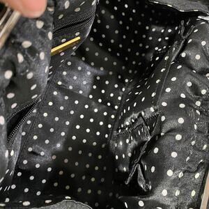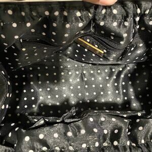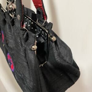 Nikita Lynn shoulder bag. Black with colorful embroidery and cut outs. Lining is black and white polka dots.