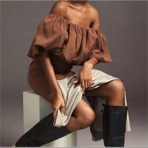 - Description: Dark brown mini dress with oversized puffy sleeves; off shoulder sleeve design