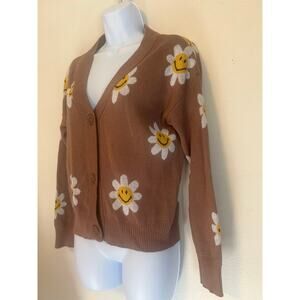 Nikka k Woman's Size M Brown Cardigan Sweater W/ Smiley Face Daisy Flowers