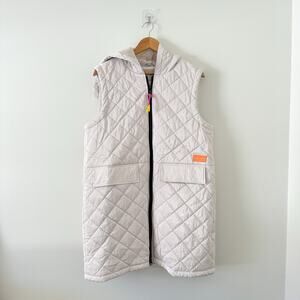 Details: Nikki Jones Montreal Spring 24 Collection Hooded Mid-Length Quilted Vest- Size: M- Color: Cream/White (Hint of Pink) - Material: 47% Viscose, 34% Polyurethane, 11% Polyester, 5% Cotton, 3% Metal- Features: Quilted, zip up, hooded, pockets, lined, dry clean, mid length, comfort, breathable, bodywarmer, outdoor, winter, casual.