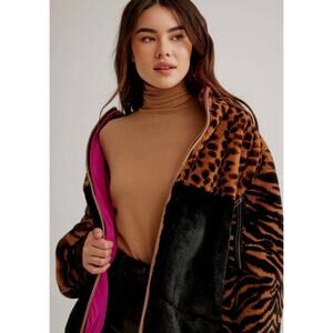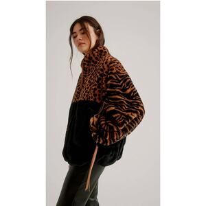 Sleeves have a black and brown tiger print and upper body is leopard print