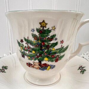 The Nikko Happy Holidays set features four coffee/tea cups and saucers adorned with a festive Christmas tree design. Crafted in Japan, this elegant collection is perfect for holiday gatherings, adding a touch of seasonal charm to your tableware.