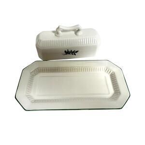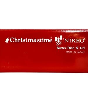This retired Nikko Japan Christmastime butter dish with cover, measures 7.5" L x 4" W x 2.5" H and is in excellent condition with its original box! It's the perfect addition to your holiday table setting. The festive design and vibrant colors will bring joy to your family and guests. Don't miss the opportunity to own this rare and collectible piece. It is a charming way to serve butter during the Christmas season. It's a delightful piece to add to your Christmas collection. # 4624
