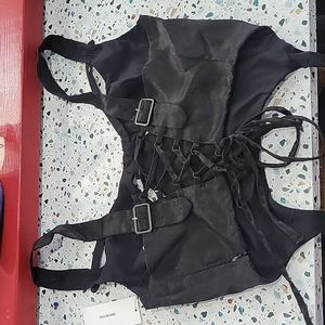 Satiny corset-inspired top from UO with cutout detailing at the bust. Cropped above the waist and fitted with a sweetheart neckline and a curved hem. Complete with silver hardware throughout and an open lace-up back. Find it only at UO.