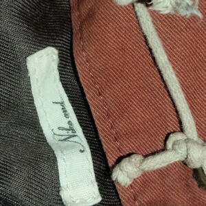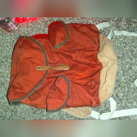 Burnt orange and tan. Multi pockets. Drawstring closure. Durable waxed canvas.