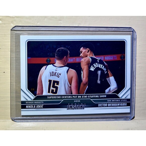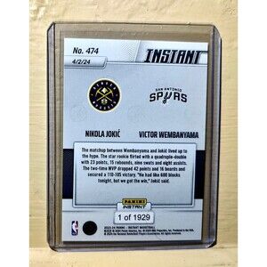 The matchup between Wembanyama and Jokić lived up to the hype. The star rookie flirted with a quadruple-double with 23 points, 15 rebounds, nine swats and eight assists. The two-time MVP dropped 42 points and 16 boards and secured a 110-105 victory. "He had like 600 blocks tonight, but we got the win," Jokić said. 2023-24 NBA Instant captures the season's key moments shortly after they happen. From the NBA Draft to milestones and record-breaking moments, NBA Instant captures it all. Collect the season's most memorable moments throughout the 2023-24 NBA season as a set and special subsets that cover everything from the NBA Draft through the NBA Finals.