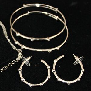 New Nikola Valenti White Gold African Violet Necklace, 18K White Gold Plated, 18-20 inch length that is new in package (Velvet Bag). New ladies cocktail ring by Mary Kay with no packaging. Two ladies bangle bracelets in silver tone with three crystals each in like new condition. Matching hoop earrings in silver tone with three crystals each in like new condition.
