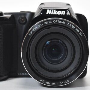 Pairing a long-zoom design with versatile imaging capabilities, the COOLPIX L330 Digital Camera from Nikon features a 20.2MP CCD sensor and EXPEED C2 image processor to produce high-resolution stills and HD 720p video recording. Complementing the imaging assets is a wide-angle to super-telephoto NIKKOR 26x optical zoom lens, which covers a 22.5-585mm equivalent focal length range, and incorporates lens-shift type Vibration Reduction to minimize the appearance of camera shake. The L330's physical design also features a large grip for additional security, a rear 3.0" 460k-dot LCD monitor, built-in pop-up flash, and is powered by four AA batteries.