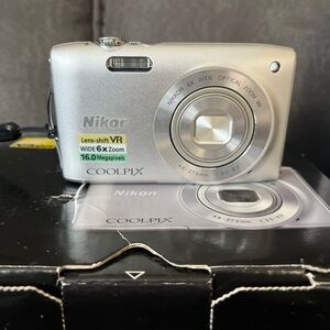 Nikon COOLPIX S3300 in sleek silver. Includes charger, cables, and user guides. Ideal for capturing high-quality photos.