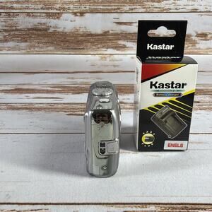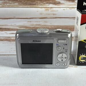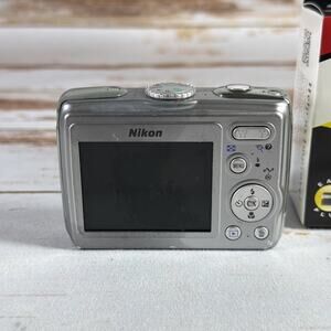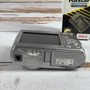 Nikon Coolpix P4 VR compact digital camera in silver finish. 8.1 megapixel resolution with zoom lens and Vibration Reduction (VR) image stabilization. Camera powers on but displays a system error and is being sold strictly for parts or repair. Includes a new generic rechargeable battery and new generic charger.