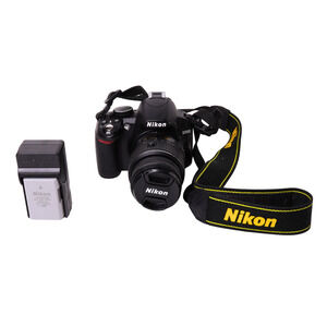 The Nikon D3100 Digital SLR Camera in black with a wall charger is a high-quality photography device with a maximum aperture of f/5.6, digital zoom of 2x, and a 3-inch screen size. It features a maximum resolution of 14.2 MP and comes with HDMI connectivity.