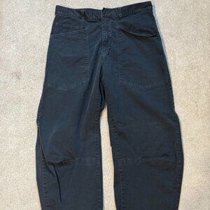 Mid-rise, relaxed fit barrel leg pant. Uniquely curved silhouette. Seam detail at knees. Gusset at inseam. Zip fly. Hidden hook-and-bar closure. Hidden stay button closure.Top-stitched front and back patch pockets. Belt loops. Designed for a 26.3" inseam.