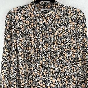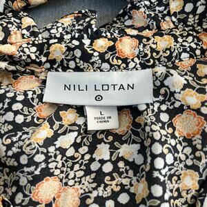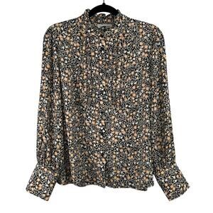 Nili Lotan Black Floral Pleated Pintuck Ruffle Button Long Sleeve Blouse LG/XL