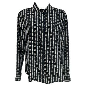 Nili Lotan Gaia Chain-Print Silk Shirt. Black and cream tones. Button-front placket. Long sleeves with buttoned cuffs. In excellent pre-owned condition, no flaws. Length 24.5", bust 40".