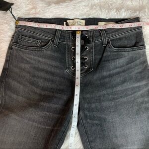 Bring your vintage A-game with these lace-up high-waisted jeans with a flared leg and frayed crop silhouette. - Lace-up tie fly - 5-pocket style - Mid rise Flared leg - Faded and whiskered - Denim construction - Fray crop hem - measurements are approximates only