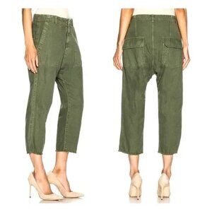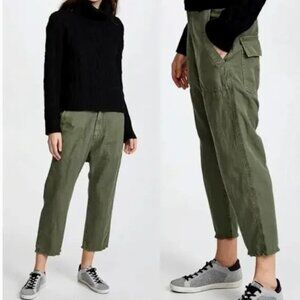 Relaxed, slouchy fit. Cropped length. Harem style silhouette - signature dropped crotch. Slant side front pockets. Flat back faux pockets. Front zip closure - with a hook & eye. Raw, frayed hem. Intentional light fading details (especially pockets, waistband and zip). Lightweight, non-stretch fabric. 97% cotton, 3% elastane. Made in USA. Machine wash cold (tumble dry low).