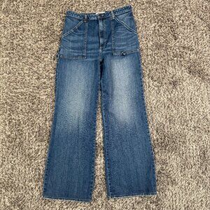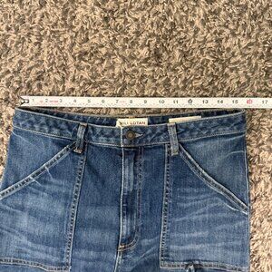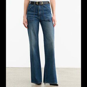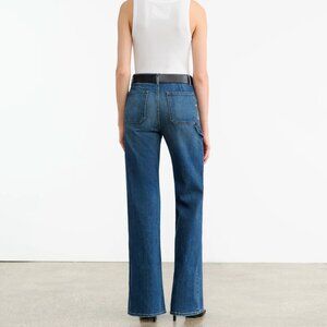 High-rise straight leg jean in Japanese stretch denim. Fitted through waist and hips. Front patch pockets. Carpenter tabs. Back patch pockets. Hammer loop. Zip fly. Shank closure. Belt loops.