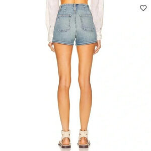 Nili Lotan Romance Lace Up Denim Jean Shorts in a faded wash are a stylish and comfortable addition to any casual wardrobe. Made in the USA from a blend of 2% polyester and 98% cotton, these high-waisted shorts feature a solid pattern, lace-up closure, and adjustable waist for a perfect fit. With a 3-inch inseam, they are perfect for walking and school activities during the summer and spring seasons. The shorts also come with pockets, drawstring, and are machine washable for easy care. Retail price is $350 and is sold out online. Comes from a smoke free home and pet friendly home. Measurements taken flat with garment un-stretched. Please ask any questions that you may have.