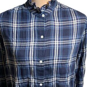 Nili Lotan Vivian Tribeca Design Shirt Navy White Plaid Ruffle Neck Medium