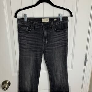Stretch denim frayed hem jean with flared cuffs. Cropped length. Button at waist. Zip at fly. Slant front pockets. Patch back pockets.