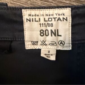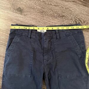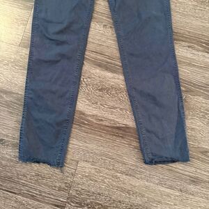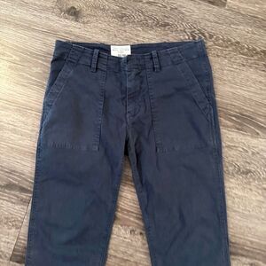 Flat front, low-rise slim pant in brushed stretch twill cotton. Raw hem. Front patch pockets. Back flap pockets. Zip fly. Hook-and-bar closure. Belt loops. Designed to hit ankle length.