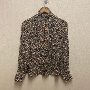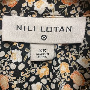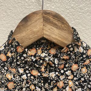 Black button down blouse with orange/white floral print from Nili Lotan for Target. High neck with ruffle. Button cuffs. Size XS.