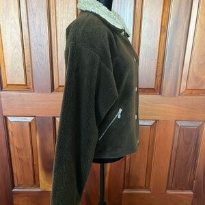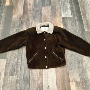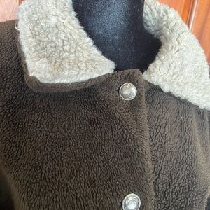 Dark brown Fleece jacket with ribbing in back, accent collar in lighter brown, front zip pockets