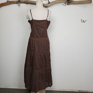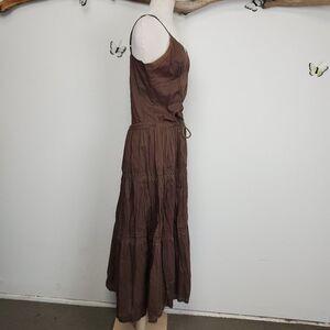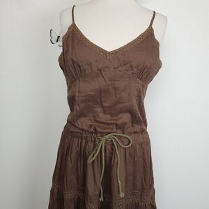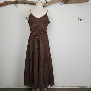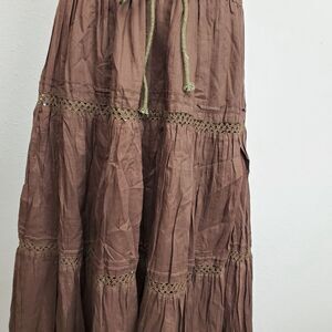 Brown 100% cotton boho gypsy style strappy maxi dress. Adjustable straps. Crochet detailing. Adjustable waist with cord belt. Gently preloved condition. Measurements are approximate and taken from a flat lay position. Please double for circumference. To ensure the best fit possible, measure a similar garment you may have and compare measurements.