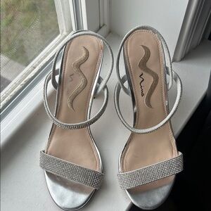 Shimmer with these stunning silver heels. Perfect for adding elegance to any outfit. Comfortable block heel style with elastic strap for a comfy fit! See photographs where a few rhinestones are missing near the toe strap.