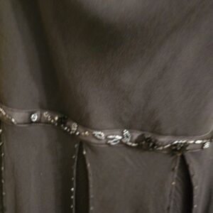 Chic black dress with sequin accents. Features a flattering V-neckline. Perfect for evening events.