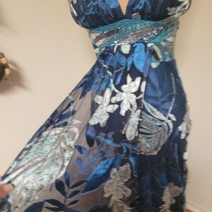 Step out in style with this elegant blue floral evening dress. Perfect for special occasions, this dress features a stunning floral pattern that adds a touch of sophistication. The rich blue color makes it a standout piece in any wardrobe.