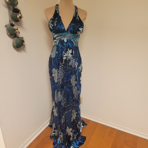 Step out in style with this elegant blue floral evening dress. Perfect for special occasions, this dress features a stunning floral pattern that adds a touch of sophistication. The rich blue color makes it a standout piece in any wardrobe.