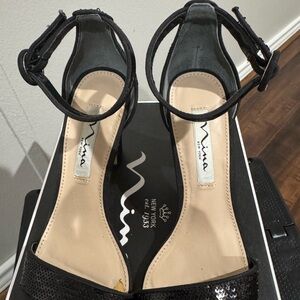 Chic black heels with a glittery finish. Adjustable ankle strap for a secure fit. Ideal for evening wear.