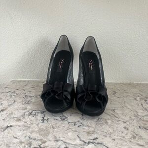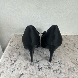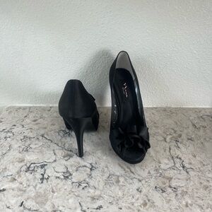 These elegant black heels by Nina feature a sleek pointed toe and a high heel, crafted from a glossy material for a sophisticated look. The standout detail is the decorative embellishment on the toe, adding a touch of elegance to any outfit.