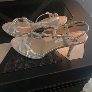 Add a dazzling touch of elegance to your evening ensemble with the Nina™ Blossom sandal. Stunning rhinestone and glitter embellishments, Fabric and mesh upper with crystal accents. Ankle strap with buckle closure. Open toe. Man-made lining and insole. Wrapped heel. Leather sole. Imported. Measurements: Heel Height: 3 1⁄4 in, Weight: 8 oz, Platform Height: 1⁄2 in. Excellent condition, gently loved and only worn once.