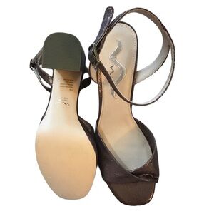 Step into elegance with Nina's brown sparkly heels, designed with a chic ankle strap and a stylish peep-toe. These heels offer a sophisticated silhouette, perfect for formal occasions. The medium-height heel ensures comfort without compromising on style. Crafted with precision, they are a versatile addition to any wardrobe.