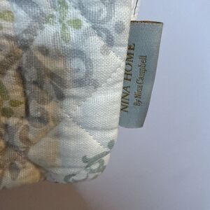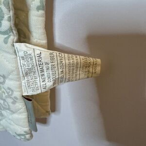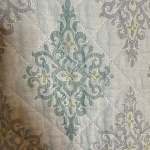 The Nina Campbell Home European Pillow Shams feature a Damask pattern in Aqua, Gray, and Sage colors, adding a touch of luxury and romance to your bedroom decor. Made of 100% Polyester with a quilted design, these rectangular Euro pillow shams have a tie closure and measure 28 inches in length and 27 inches in width. The French Country style shams are machine washable, making them easy to care for and perfect for adding an elegant touch to your bedding ensemble. There is a small spot on the back of one of the shams. Shown on the top of the last picture. Otherwise washed and in beautiful, like new condition.
