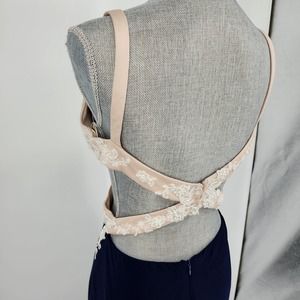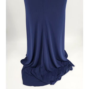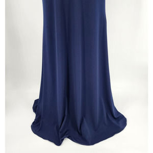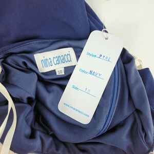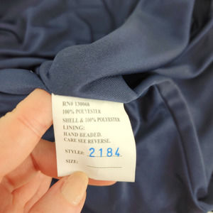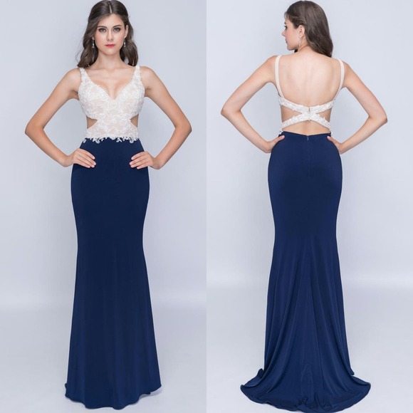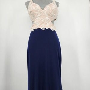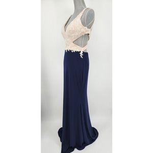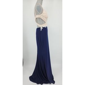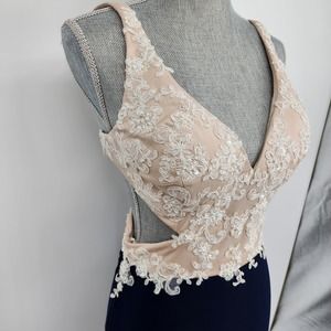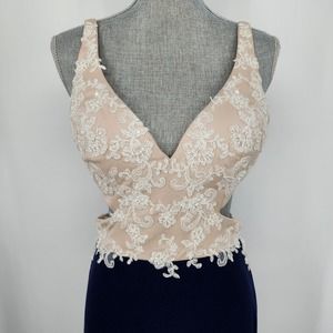 Nina Canacci Formal Evening Dress 10 Embellished Beaded Cut Out Navy Blue Cream