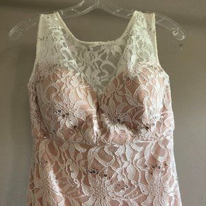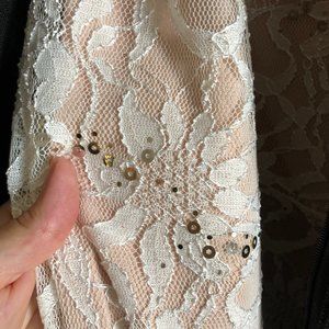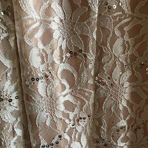 Ivory lace with champagne lining. Silver sequins. Square neck with illusion bodice. Comes with dress garment bag.