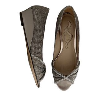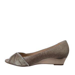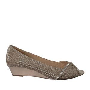 These Nina wedge dress shoes feature a peep-toe design, a low wedge heel, and a glittery material, with silver rhinestone embellishments on the toe.