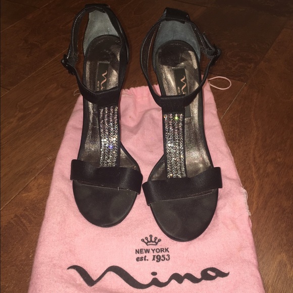 Sexy black Nina heels with rhinestones are the perfect addition to any dress. These heels were worn about three times. Beautiful stone detail down the front.