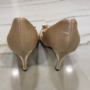 Nina New York heels in size 37/ US 6.5 in gold champagne satin. Pleated bow on front. Satin fabric upper with leather outsole. Peep toe. Approx 3.25 inch heel.